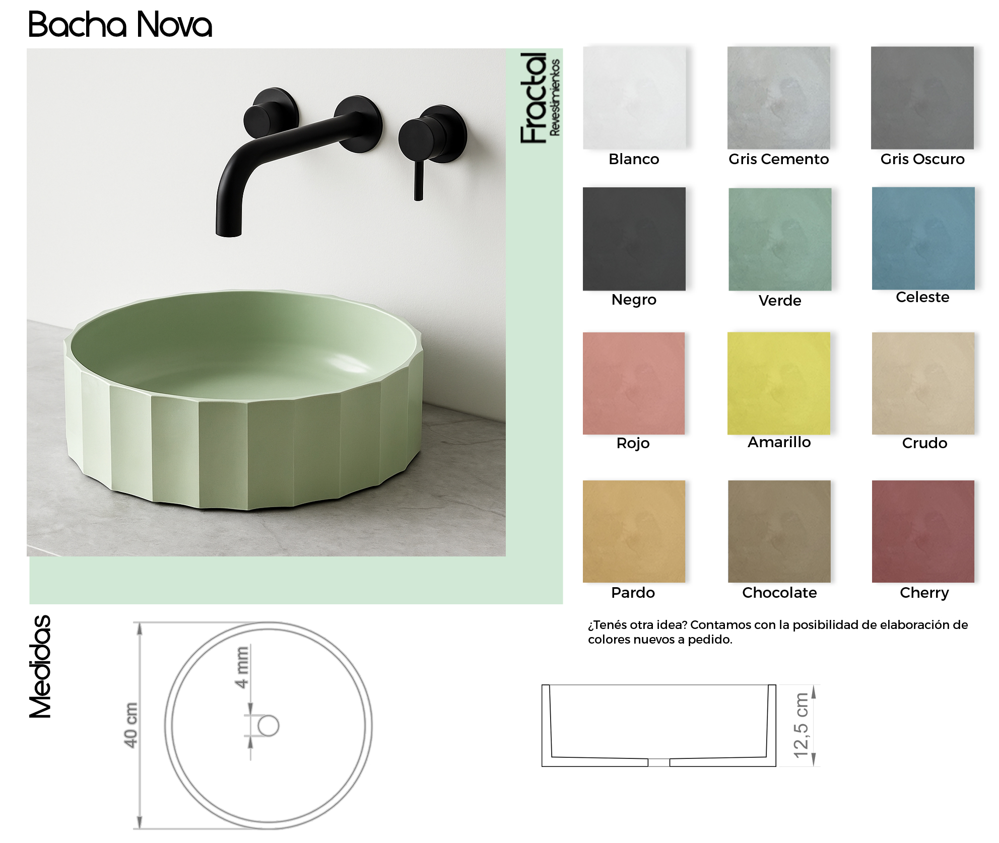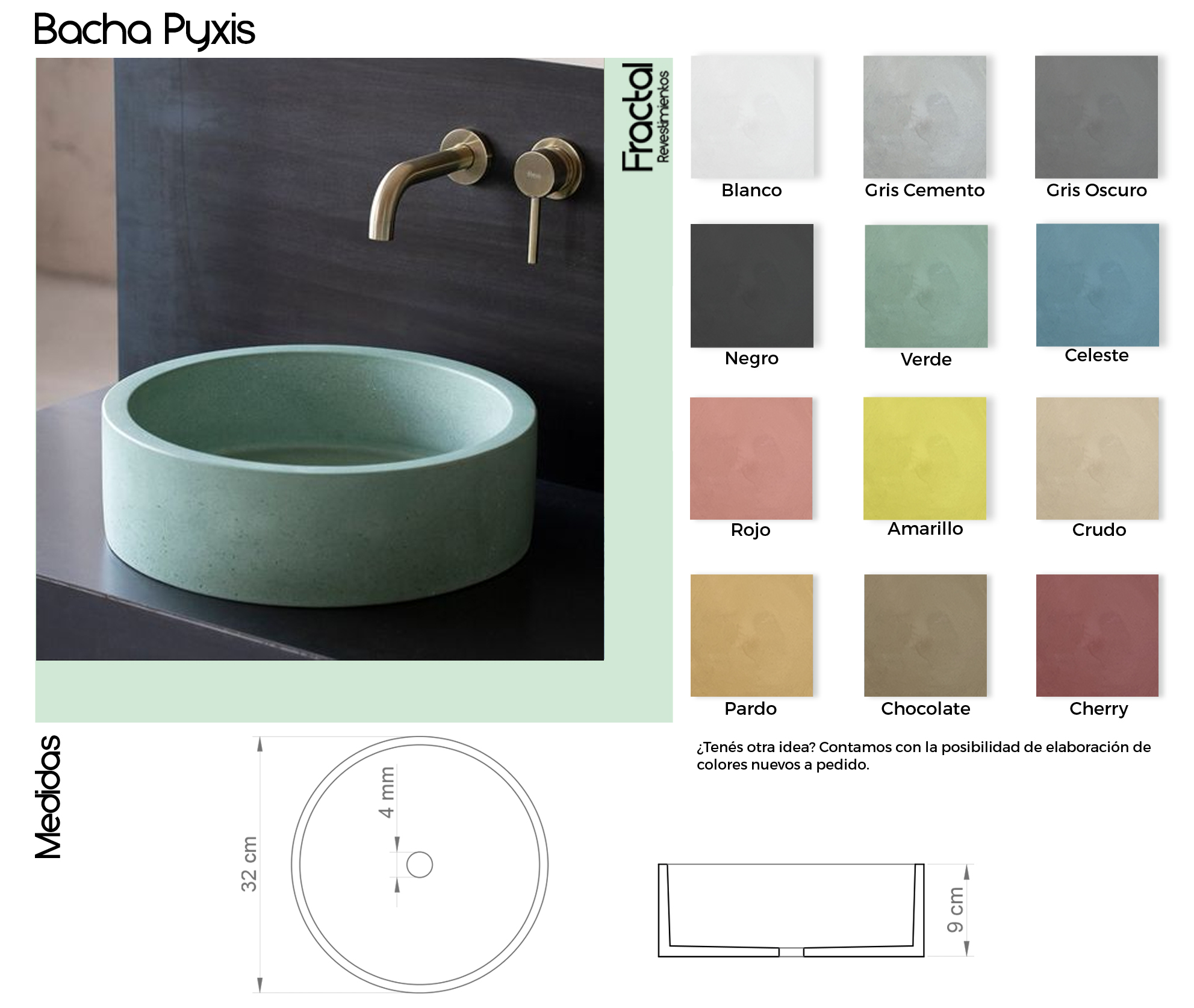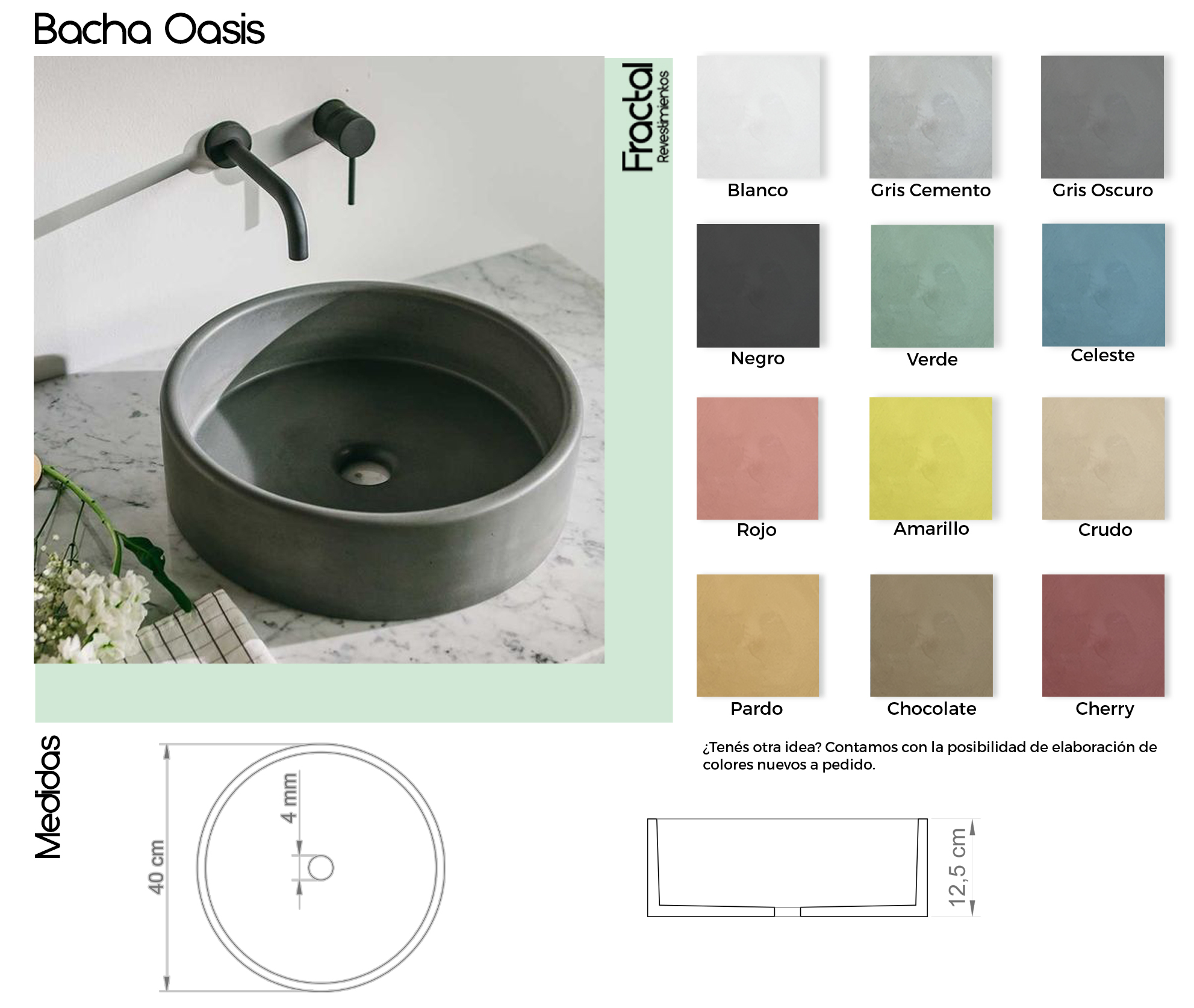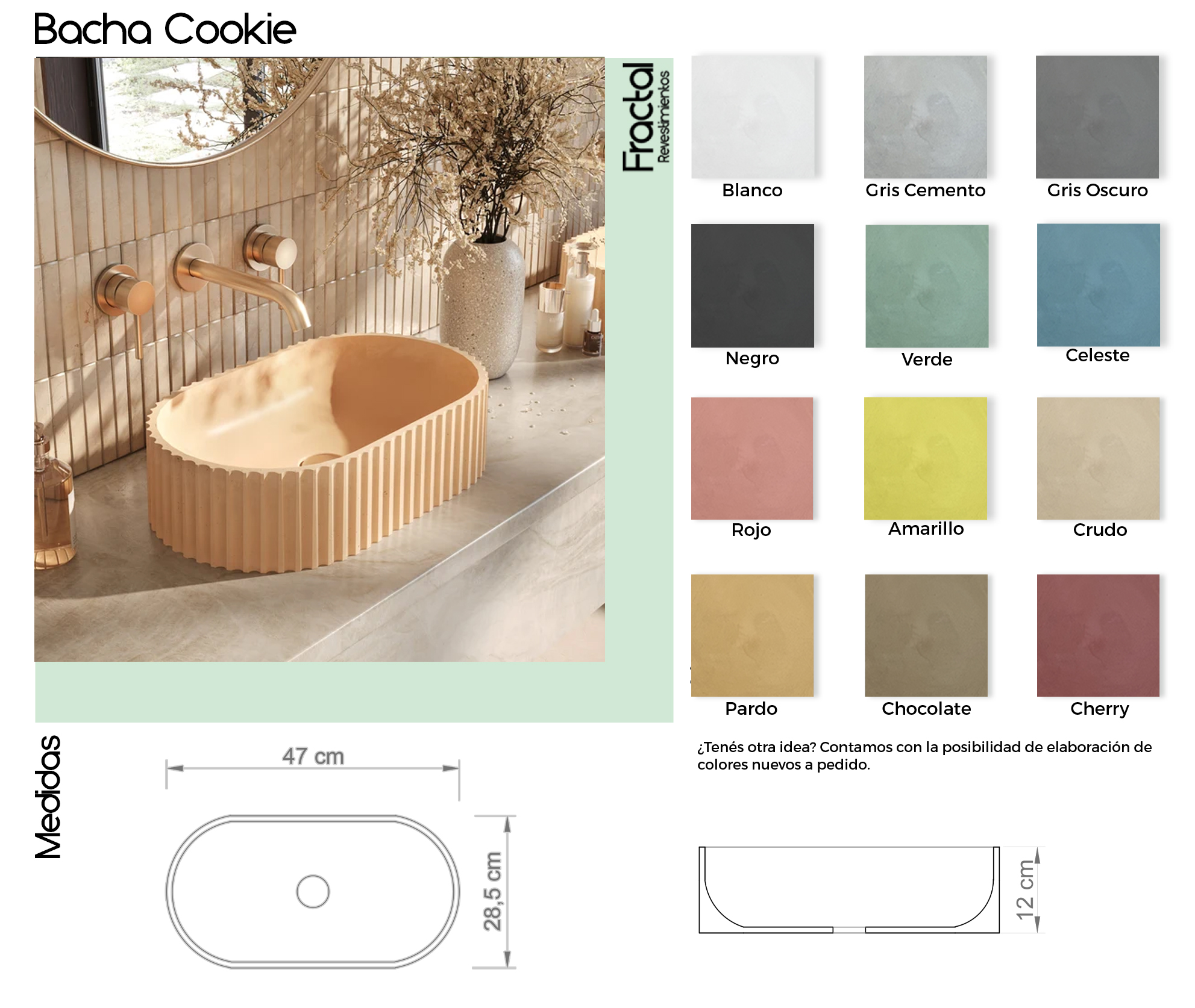 Las bachas de cemento Fractal fueron diseñadas combinando diseño, funcionalidad y durabilidad. Se fabrican de manera homogénea a partir de una única mezcla de dosaje, lo que garantiza una coloración uniforme, una textura auténtica y una alta resistencia al uso diario.